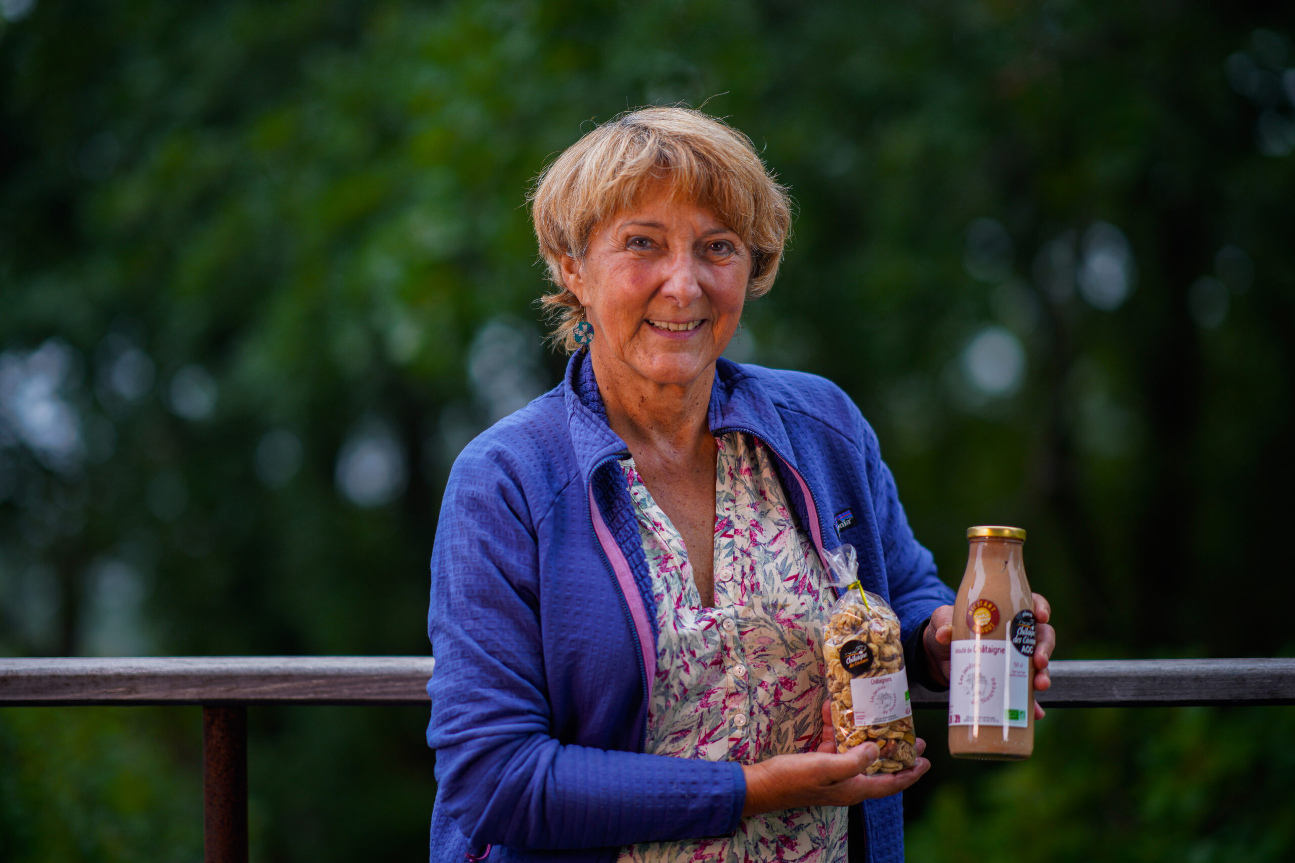 Christine a replanté 150 pommiers de variétés anciennes et de plein vent, qui n’ont pas besoin de traitement et font un excellent jus qu’elle vend sur place, sur les salons bio, dans les restaurants et les boutiques d’épicerie fine. Elle a replanté aussi toutes sortes de variétés de fruitiers et, l’an dernier, a même commencé la culture de grenadiers et pistachiers en anticipation du réchauffement climatique. Enfin, depuis 3 ans, elle a racheté une châtaigneraie de 10 hectares qu’elle restaure activement. Pommes, figues, framboises, châtaignes, avec l’ensemble de sa production, elle propose à la ferme plus de 40 produits transformés : jus, confitures, soupes et biscuits.