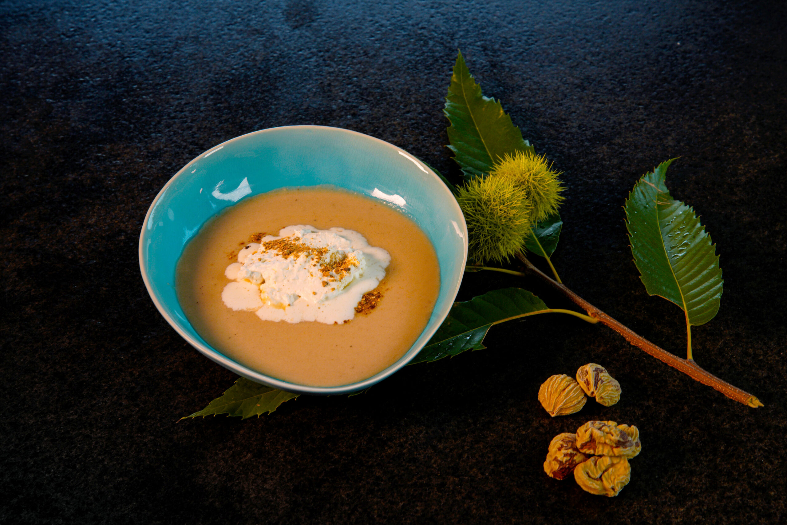 Servir le velouté en ajoutant, au centre de l’assiette, une cuillère de chantilly aux cèpes.